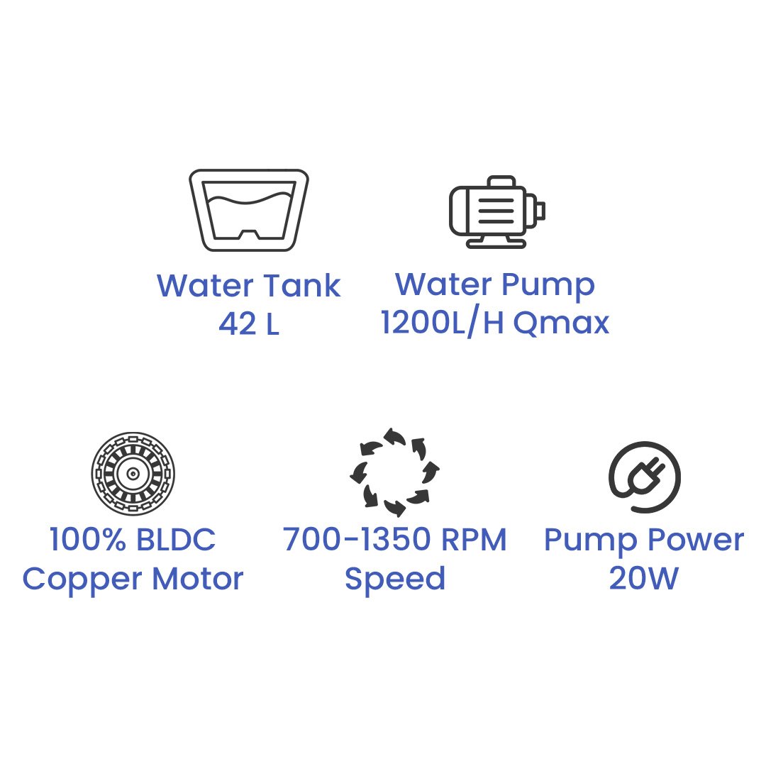 • وظيفة الرذاذ: مجهزة بميزة الرذاذ التي ترش رذاذًا ناعمًا لتبريد الهواء المحيط، مما يجعلها مثالية للظروف الحارة والجافة.