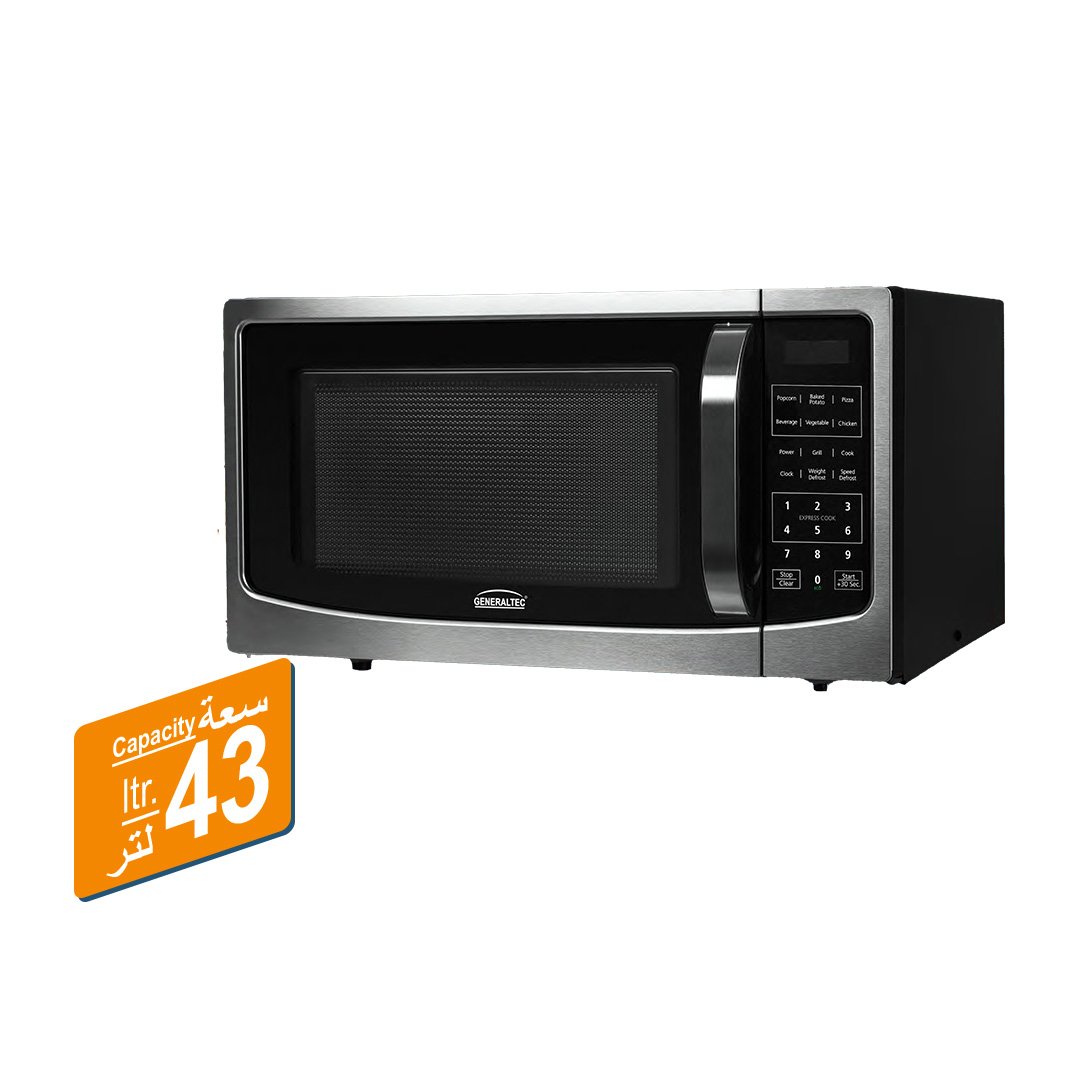 فرن الميكروويف GMO45GS من جينيرالتك بسعة 43 لتر هو فرن ميكروويف أكبر وأكثر قوة، مما يجعله مناسبًا للعائلات أو المستخدمين الذين يحتاجون إلى إعداد وجبات أكبر أو الطهي بكميات أكبر. فيما يلي نظرة عامة على ميزاته المحتملة: