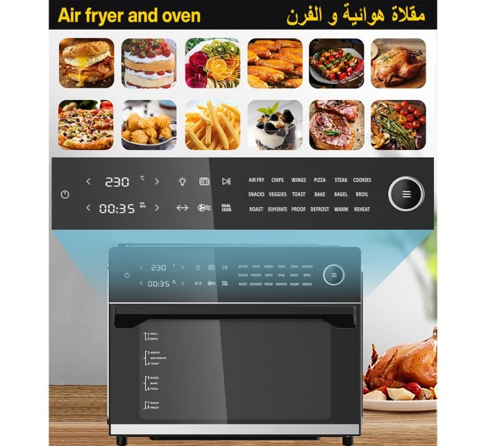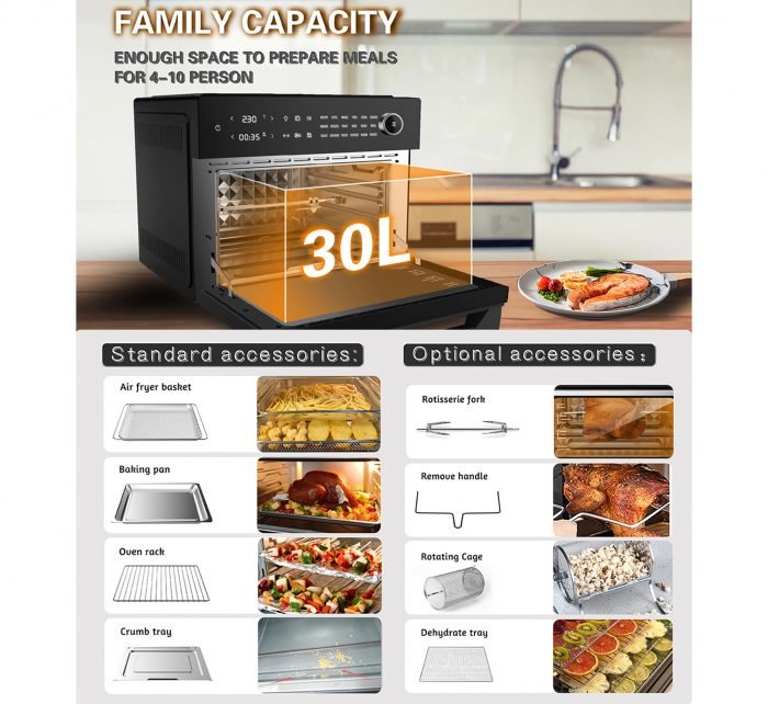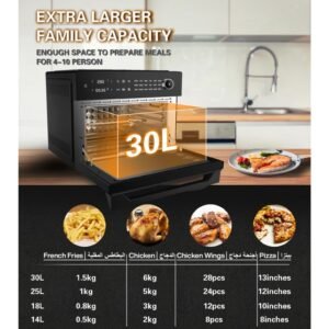 - إن السعة الكبيرة التي تبلغ 30 لترًا مثالية للعائلات الكبيرة أو تحضير الوجبات أو طهي كميات كبيرة من الطعام. يسمح لك هذا الحجم أيضًا بطهي أطباق متعددة في وقت واحد، مما يجعله رائعًا للتجمعات أو تحميص دجاجة كاملة أو عدة بيتزا.