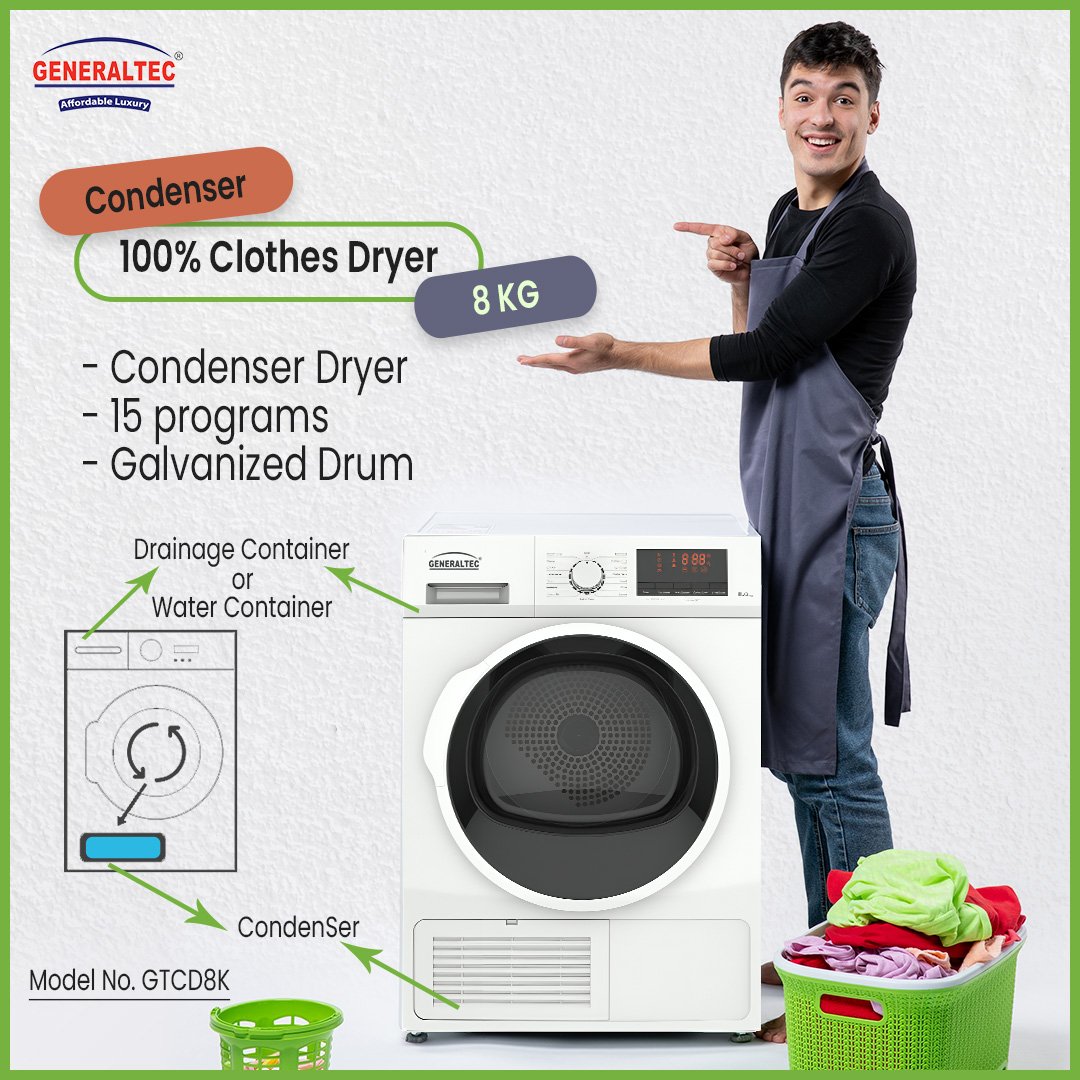 Generaltec Model No. GTCD8K 8 KG Front Load 100% Condenser Dryer, 15 Programs, Galvanized Drum Features:
